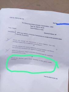 اے بی وی پی کے مطابق، بی اے (آنرز) فرسٹ سمسٹر کے مضمون "سوشل پروبلمز اِن انڈیا" کے امتحان میں ایک سوال شامل کیا گیا تھا، جس میں طلبہ سے کہا گیا کہ وہ "بھارت میں مسلم اقلیت کے خلاف ہونے والے مظالم کی مثالوں کے ساتھ وضاحت کریں"۔